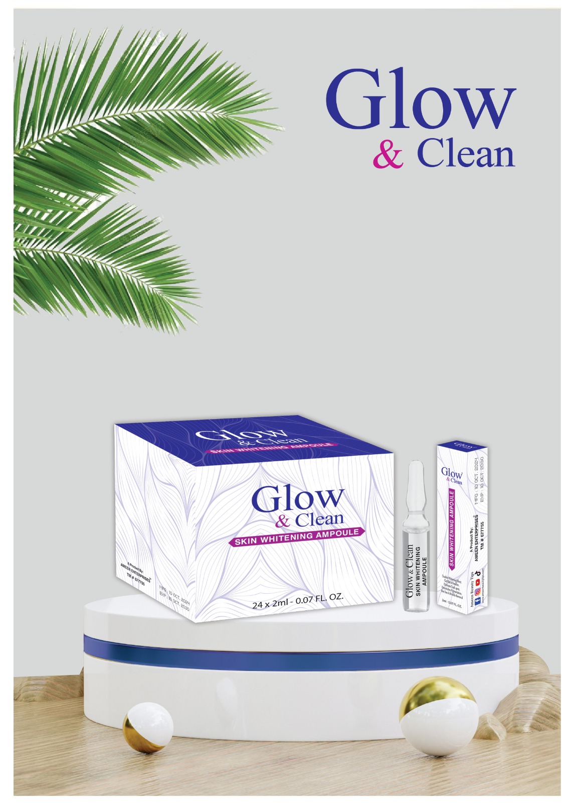 Cleanse your face thoroughly. Apply 2–3 drops of Glow & Clean Skin Whitening Ampoule Serum onto the face and neck. Gently massage until fully absorbed. Use twice daily—morning and night—for best brightening results. Follow with moisturizer and sunscreen during the day.